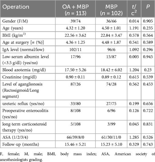 In the study examining the impact of preoperative bowel preparation methods on anastomotic leakage and intestinal motility recovery in LHSA, patients were divided into two groups: those receiving oral antibiotics plus mechanical bowel preparation (OA + MBP) and those receiving solely MBP (Table 1). There was no statistically significant difference in gender distribution (female/male) between OA + MBP (39/74) and MBP (36/66) groups (χ2 = 0.014, P = 0.905). Similarly, the mean age of patients, 4.32 ± 1.20 years in the OA + MBP group vs. 4.50 ± 1.01 years in the MBP group, did not differ significantly (t = 1.191, P = 0.235). Other parameters, including body mass index (BMI), age at surgery, immunoglobulin A (IgA) levels, serum albumin levels, blood azotemia, and creatinine levels, exhibited no significant differences between groups (P > 0.05). The level of aganglionosis, incidence of ureteric reflux, preoperative enterocolitis, long-term corticosteroid therapy, ASA classification, and follow-up duration were also similar across both groups, indicating homogeneous baseline characteristics (P > 0.05). These findings establish a robust baseline for assessing the outcomes of the different preoperative bowel preparation methods in terms of anastomotic leakage and intestinal motility recovery.