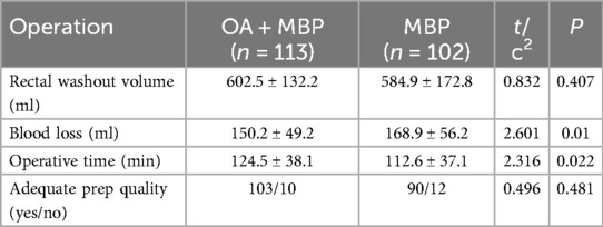 The OA + MBP group exhibited lower blood loss, with an average of 150.2 ± 49.2 ml compared to 168.9 ± 56.2 ml in the MBP group, reaching statistical significance (t = 2.601, P = 0.01) (Table 2). Additionally, the operative time was longer in the OA + MBP group, at 124.5 ± 38.1 min, compared to 112.6 ± 37.1 min in the MBP group (t = 2.316, P = 0.022). Conversely, the rectal washout volume showed no significant difference between the two groups, measuring 602.5 ± 132.2 ml for OA + MBP and 584.9 ± 172.8 ml for MBP (t = 0.832, P = 0.407). The quality of the bowel preparation was deemed adequate in both groups, with no significant difference observed in the proportion of patients with adequate preparation (P = 0.481). These findings suggest a trade-off between reduced blood loss and increased operative time in the OA + MBP group.