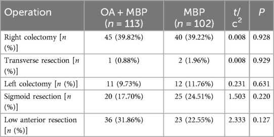 The distribution of right colectomy was comparable, with 39.82% in the OA + MBP group and 39.22% in the MBP group (χ2 = 0.008, P = 0.928) (Table 3). Transverse resection occurred in 0.88% of OA + MBP patients and 1.96% of MBP patients (χ2 = 0.008, P = 0.929). Similarly, left colectomy was performed in 9.73% of the OA + MBP group and 11.76% of the MBP group (χ2 = 0.231, P = 0.631). Sigmoid resection rates were 17.70% for OA + MBP and 24.51% for MBP (χ2 = 1.503, P = 0.22), while low anterior resection occurred in 31.86% of the OA + MBP group compared to 22.55% of the MBP group (χ2 = 2.333, P = 0.127). Overall, the type of surgical resection did not significantly differ between the two groups, indicating similar operative strategies across both preoperative bowel preparation methods.