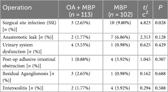 In the investigation of operative complications between the OA + MBP group and the mechanical bowel preparation (MBP) group in patients undergoing LHSA, a significant reduction in surgical site infections (SSI) was observed in the OA + MBP group, occurring in 2.65% of patients compared to 9.80% in the MBP group (χ2 = 4.823, P = 0.028) (Table 4). Other complications, such as the incidence of anastomotic leaks, were lower in the OA + MBP group (1.77%) compared to the MBP group (6.86%), though this was not statistically significant (P = 0.128). Rates of urinary system dysfunction (3.53% vs. 0.98%, P = 0.429), postoperative adhesive intestinal obstruction (0.88% vs. 3.92%, P = 0.307), residual aganglionosis (2.65% vs. 0.98%, P = 0.688), and enterocolitis (1.77% vs. 3.92%, P = 0.588) did not differ significantly between the two groups. These findings indicate that while OA + MBP significantly reduces the risk of SSIs, other observed complications do not show statistical differences between preparation methods.