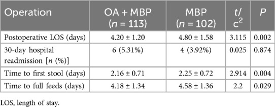 Results: The OA + MBP group demonstrated a significant reduction in SSIs (2.65% vs. 9.80%, P = 0.028) and shorter postoperative LOS (4.20 ± 1.20 days vs. 4.80 ± 1.58 days, P = 0.002). Time to first stool (2.16 ± 0.71 days vs. 2.25 ± 0.72 days, P = 0.004) and full feeds (4.18 ± 1.34 days vs. 4.58 ± 1.36 days, P = 0.029) were improved in the OA + MBP group. On the fifth postoperative day, CRP levels were lower in the OA + MBP group (60.1 ± 19.7 mg/L vs. 67.4 ± 22.5 mg/L, P = 0.012).
