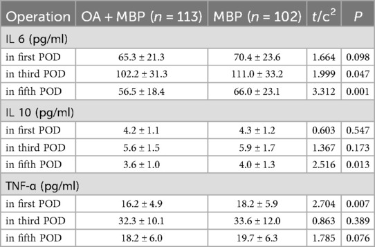 Interleukin 6 (IL-6) levels were significantly lower in the OA + MBP group on the third postoperative day (POD) (102.2 ± 31.3 pg/ml vs. 111.0 ± 33.2 pg/ml, t = 1.999, P = 0.047) and the fifth POD (56.5 ± 18.4 pg/ml vs. 66.0 ± 23.1 pg/ml, t = 3.312, P = 0.001) (Table 6). Interleukin 10 (IL-10) levels on the fifth POD were also significantly lower in the OA + MBP group (3.6 ± 1.0 pg/ml) compared to the MBP group (4.0 ± 1.3 pg/ml, t = 2.516, P = 0.013). In terms of TNF-α, significant reduction was observed on the first POD in the OA + MBP group (16.2 ± 4.9 pg/ml) compared to the MBP group (18.2 ± 5.9 pg/ml, t = 2.704, P = 0.007). No significant differences were observed in IL-6 levels on the first POD, IL-10 levels on the first and third PODs, or TNF-α levels on the third and fifth PODs. These findings indicate that OA + MBP can modulate the inflammatory response post-surgery as evidenced by reductions in select cytokines across different postoperative days.