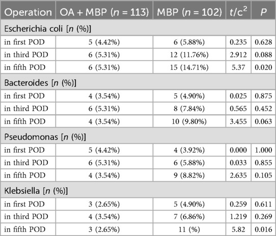 On the fifth postoperative day (POD), Escherichia coli was isolated in 5.31% of the OA + MBP group compared to 14.71% in the MBP group, showing a significant difference (χ2 = 5.37, P = 0.02) (Table 7). Similarly, Klebsiella was isolated in 2.65% of the OA + MBP group vs. 10.78% in the MBP group, which was also statistically significant (χ2 = 5.82, P = 0.016). In contrast, the detection rates of Bacteroides and Pseudomonas across the first, third, and fifth PODs did not show significant differences between the two groups (P > 0.05 for all comparisons). These results suggest that the OA + MBP regimen may effectively reduce the presence of certain bacterial pathogens postoperatively, contributing to a potentially lower risk of infectious complications.