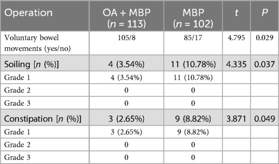 In evaluating postoperative bowel function according to the Krickenbeck criteria in patients undergoing LHSA, the group receiving oral antibiotics and mechanical bowel preparation (OA + MBP) showed significantly better outcomes compared to the MBP group (Table 8). Voluntary bowel movements were more frequent in the OA + MBP group, with 105 of 113 patients reporting positive results, in contrast to 85 of 102 in the MBP group (P = 0.029). Additionally, the incidence of postoperative soiling was significantly lower in the OA + MBP group, occurring in 3.54% of patients, compared to 10.78% in the MBP group (P = 0.037). Constipation rates also favored the OA + MBP group, with only 2.65% affected, compared to 8.82% in the MBP group (P = 0.049). Notably, both soiling and constipation were confined to grade 1 severity, as there were no cases of grade 2 or grade 3 in either group. These results indicate that OA + MBP is associated with improved postoperative bowel function after LHSA.