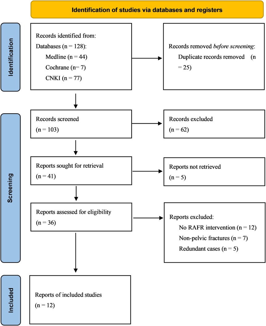 The initial database search identified a total of 128 studies, of which 25 were duplicates. After screening the titles and abstracts of the 103 remaining articles, 62 were excluded due to irrelevance. Five articles could not be retrieved despite efforts, leaving 36 articles for full-text review. Among these, 24 were excluded: 12 did not involve RAFF intervention, 7 were not focused on pelvic fractures, and 5 were redundant cases. Ultimately, 12 studies met the inclusion criteria and were selected for qualitative synthesis of the literature (Figure 1).