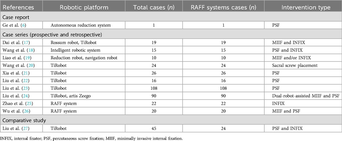 The studies reviewed utilized three robotic platforms: the Rossum Robot (Beijing Jishuitan Hospital and Rossum Robot Co., Ltd., Beijing, China), TiRobot (TINAVI Medical Technologies Co., Ltd., Beijing, China), and a dual robotic system combining TiRobot with the Artis Zeego system (Siemens, Germany). The Rossum Robot featured a six-degree-of-freedom (6-DOF) manipulator, elastic traction, and mirrored path planning capabilities, enabling high precision in pelvic fracture reduction (17). TiRobot, the most commonly used system, provided sub-millimeter precision, advanced navigation, and automatic trajectory correction (21, 23, 27). The Artis Zeego system introduced real-time 3D imaging for superior surgical visualization and planning, enhancing the dual robotic system's functionality (24). The types of RAFF systems and their applications across included studies are summarized in Table 1.