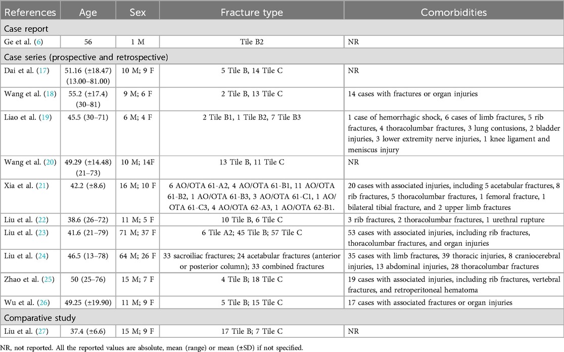Across the studies, the patient population included individuals aged 13–81 years, with an average age ranging from 38.5 to 56 years. Male patients predominated (55%–62%). Most fractures were classified as Tile B (68.5%–72%), with Tile C fractures comprising the remainder. Preoperative preparation involved routine CT imaging, 3D reconstructions, and skeletal traction in cases of vertical instability (6, 17, 18, 23, 26). Table 2 presents the demographic characteristics, fracture types, and comorbidities of the study population.