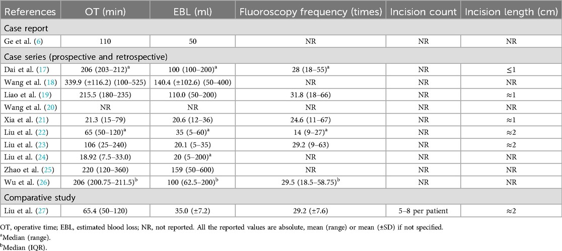 The number of fluoroscopic exposures averaged 14–32 instances per procedure, significantly lower than traditional methods. Incisions were typically less than 2 cm in length, with a mean of 1.5 cm, underscoring the minimally invasive approach (18, 20, 24, 27).