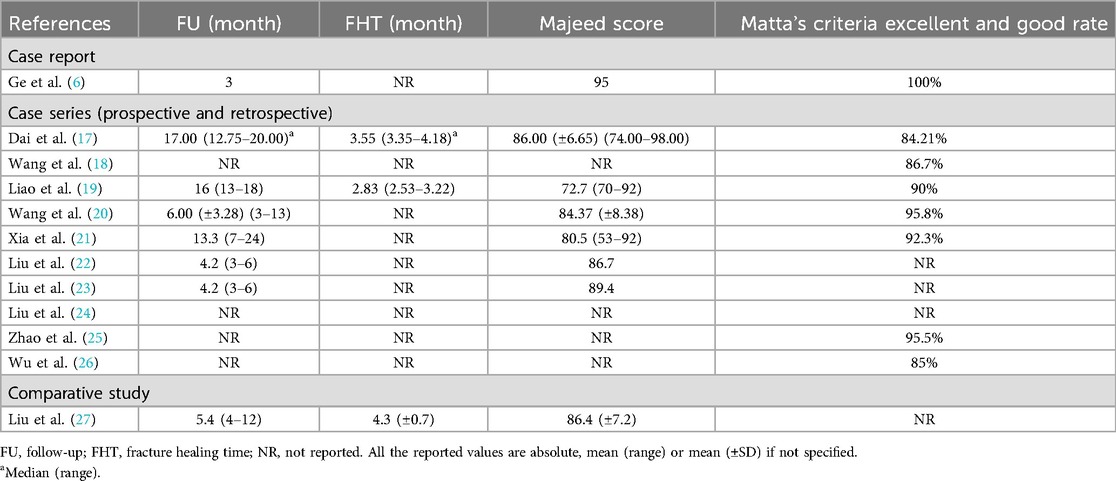 Follow-up durations ranged from 3 to 17 months (6, 17, 19, 21). Fracture healing times averaged 3.5 months (17, 19, 27), and postoperative functional outcomes were excellent, with Majeed scores ranging from 86.7 to 89.4 (17, 22, 23). Reduction quality, assessed using Matta criteria, achieved excellent-to-good rates of 84.21%–95.8% (17, 22, 23, 26), demonstrating the effectiveness of robotic assistance in achieving anatomical alignment (17, 19, 25). Follow-up duration, healing time, and functional scores are provided in Table 4.
