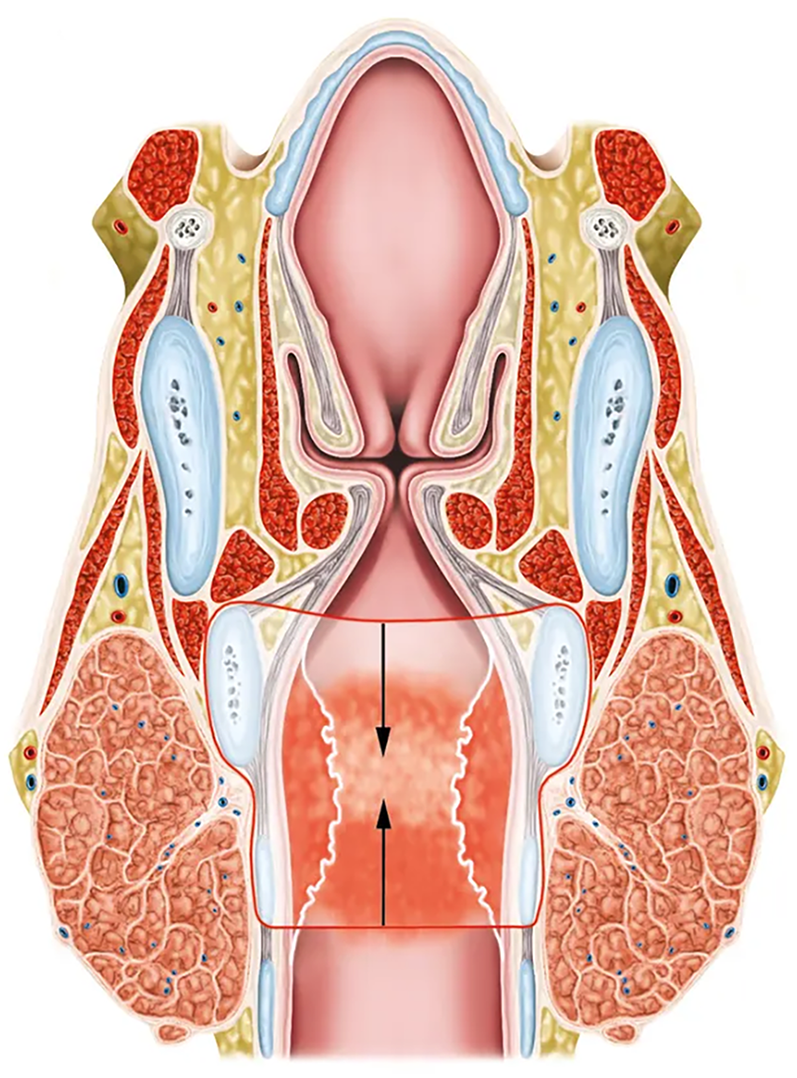 Coronal section of a subglottic stenosis at the level of the cricoid cartilage and the first tracheal ring. The extent of resection during partial cricotracheal resection is indicated in red lines. The arrows show the direction of the anastomosis between the trachea and the posterior cricoid and thyroid cartilages.