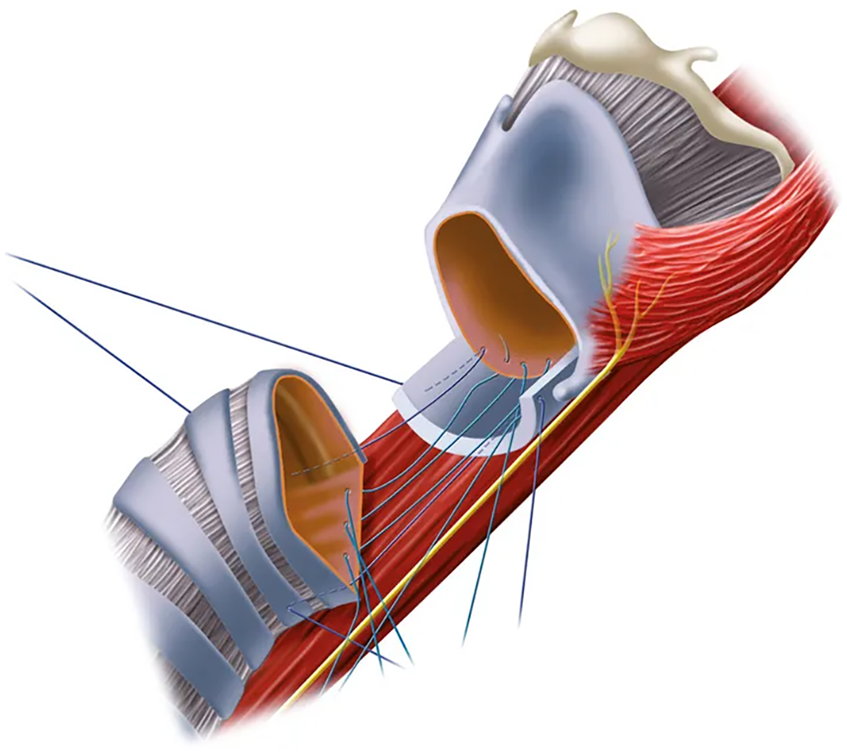 An anterolateral view of the cricotracheal anastomosis with placement of the sutures for the posterior cricotracheal anastomosis. Note the denudated posterior cricoid plate.