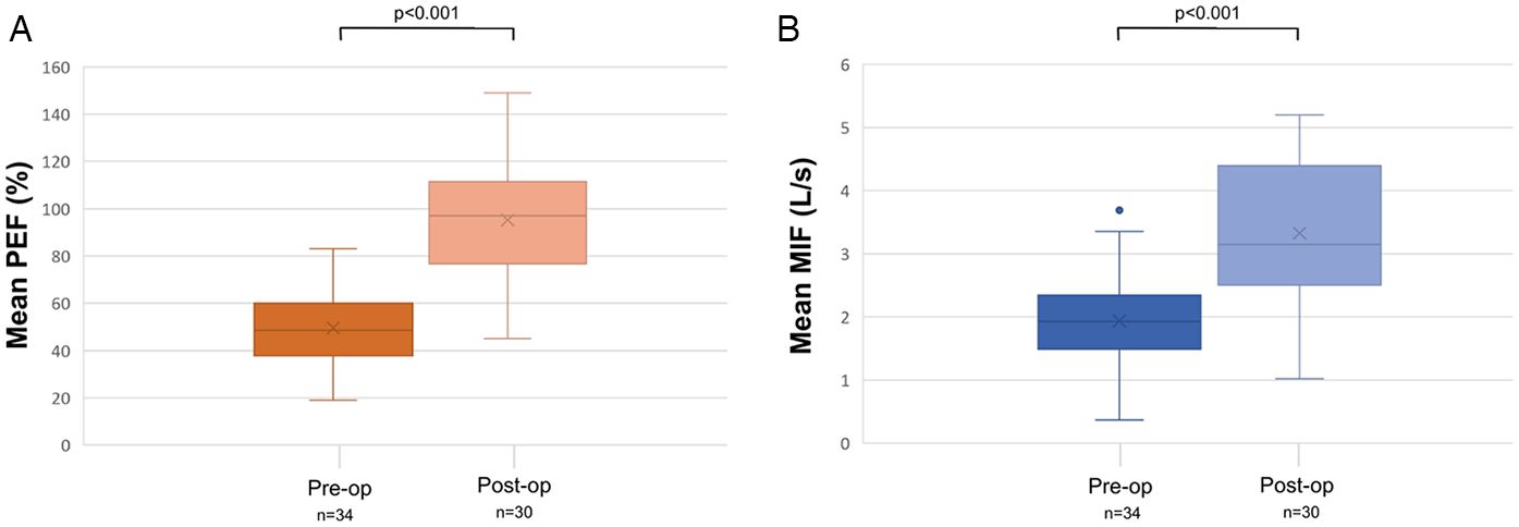 Respiratory outcomes were evaluated by spirometry, including peak expiratory flow (PEF) and MIF50 at 6 weeks, 3 months, 6 months and 1 year after surgery and compared to pre-operative pulmonary function. In this paper, the most recent outcome measures are reported. PEF is the maximal flow during a short maximal expiratory effort after full inspiration; it reliably reflects the treatment outcomes in patients with SGS and can be utilized for longitudinal monitoring of individuals with SGS (18–20). MIF50 is defined as the flow rate during the middle of inspiration, measured at 50% of the forced vital capacity (FVC) (21).