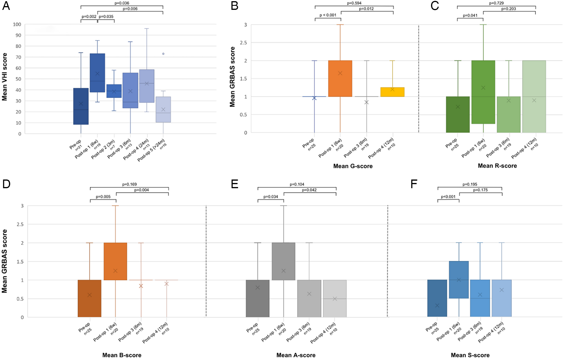 Auditory-perceptual evaluation of voice quality was done by experienced speech and language pathologists using the GRBAS scoring system. Grade (G) represents the overall degree of hoarseness of the voice, roughness (R) represents an impression of the irregularity of vocal fold vibrations and breathiness (B) represents a psychoacoustic impression of the extent of air leakage through the glottis. Astheny (A) denotes weakness or lack of power in the voice and strain (S) represents a hyperfunctional state of the phonation heard (15). Subjective evaluation of the voice by assessing psychosocial impact of the voice quality as reported by patients was performed with the VHI-10 questionnaire, with higher scores indicating a higher level of vocal impairment (16). According to institutional guidelines, introduced in 2020, all SGS patients needing CTR undergo a complete vocal assessment based on the ELS protocol including the VHI-10 score preoperatively and 6 weeks after CTR (17). If patients experience suboptimal postoperative vocal outcomes, speech and language therapy is initiated and evaluation of vocal quality is repeated 3, 6 and 12 months postoperatively, depending on the duration of vocal complaints. If, at the time of data retrieval and manuscript preparation, included patients did not have a recent vocal assessment, they were contacted by phone for voice evaluation using the VHI-10.