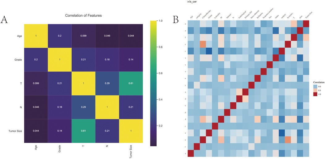 Figure 1. The correlation analysis of features. (A) The correlation of variables. Yellow indicates positive correlation and purple indicates negative correlation. (B) Correlation heat map.