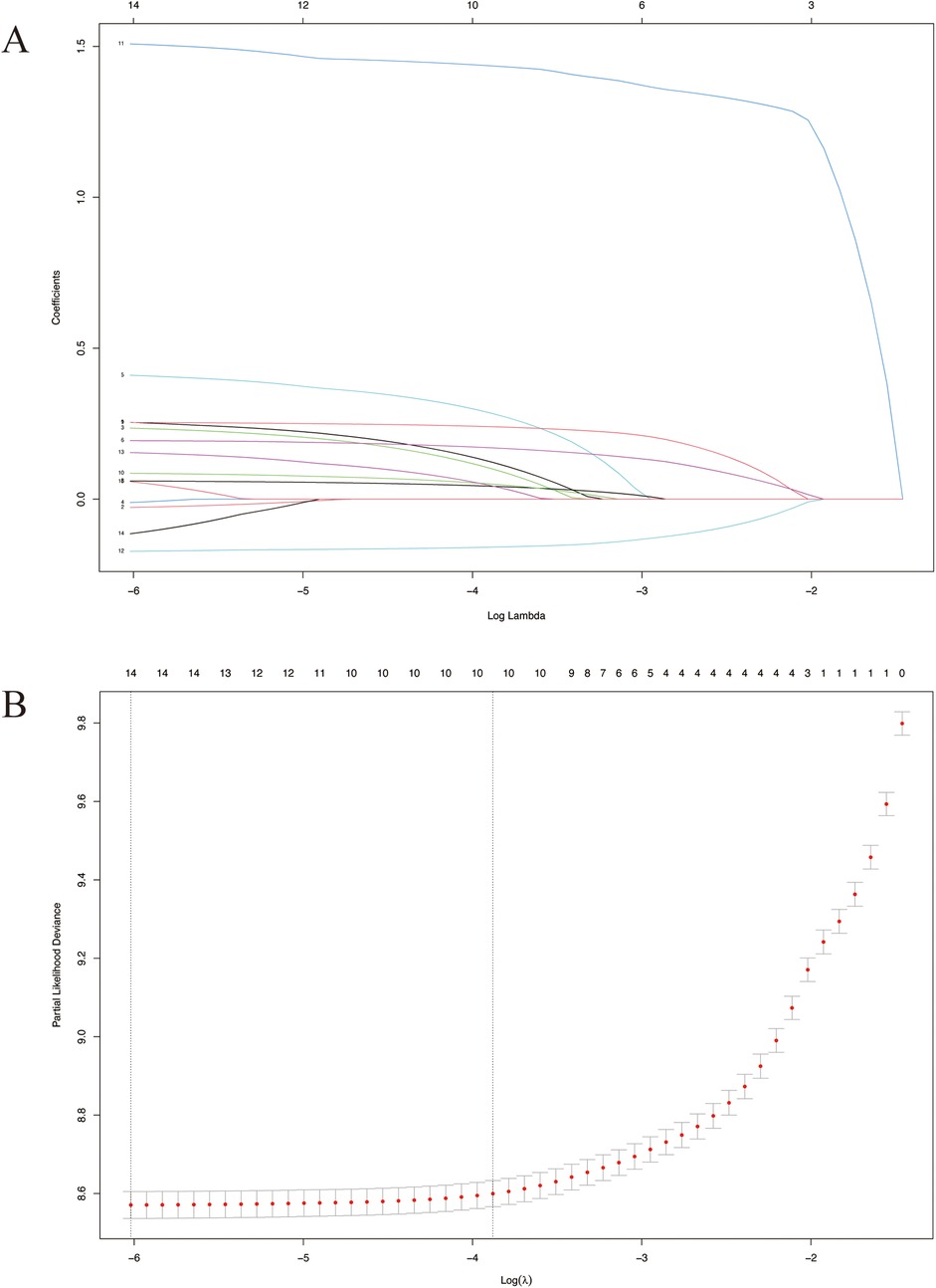 Figure 2. LASSO survival analysis. (A) Coefficient profile plots showing how the size of the coefficients of clinical factors shrinks with increasing value of the penalty, with the factors and their regression coefficients selected for the model based on the optimal for the LASSO model. (B) Penalty plot for the LASSO model; color error bars indicate standard error. LASSO, least absolute shrinkage and selection operator.