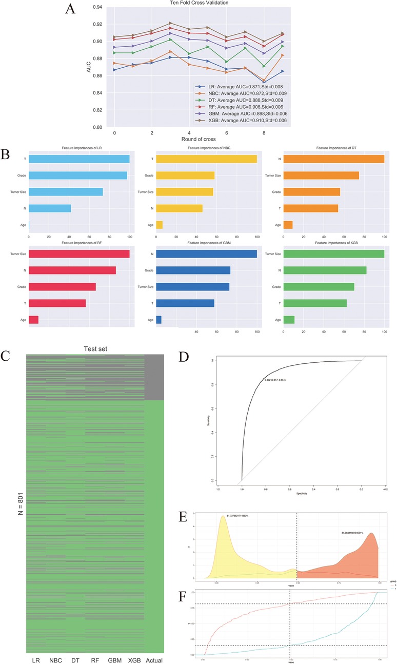 Figure 3. The predictive performance of six machine learning algorithms. (A) 10-fold cross-validation of machine learning algorithms. (B) Relative importance ranking of features. (C) Heat map of accuracy rate of prediction results. (D) ROC curve of XGB algorithm. (E) Transfer risk density. (F) The clinical utility curves (CUCs) of the XGB algorithm.