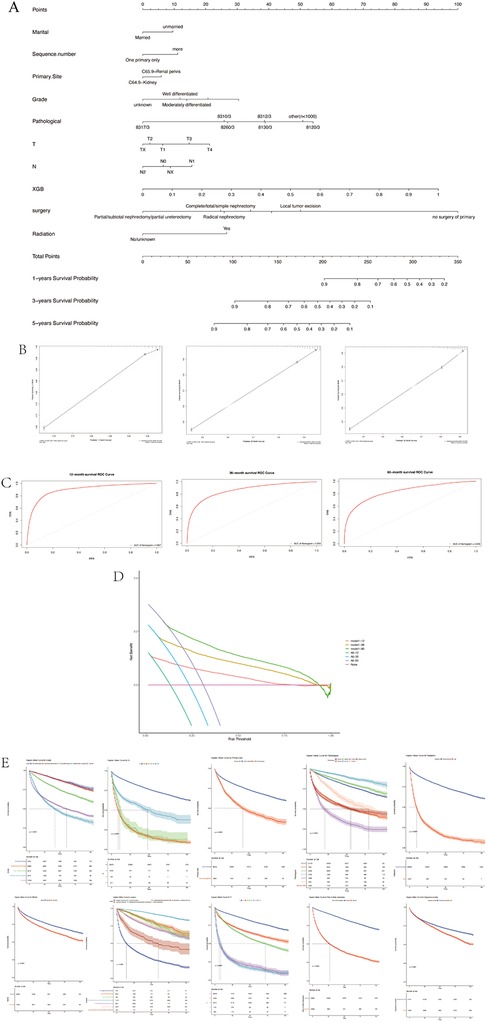Based on the clinicopathological characteristics listed in Table 1, together with the predicted risk of the XGB algorithm, we next employed LASSO Cox analysis to screen independent risk factors to predict survival possibility. Variables including marital status, sequence number, primary site, grade, pathological type, T-stage, N-stage, the calculated risk of XGB, surgical and radiation treatment were incorporated to establish a nomogram to predict the 1-, 3-, and 5-years survival probability (Figure 4A). The ROC and calibration curves of both training and test sets at 1, 3, and 5 years all displayed good consistency between actual and predictive values (Figures 4B,C). And then, the DCA was applied to check the clinical practicability (Figure 4D). The net benefits of the nomogram, in 1-, 3-, 5-year OS prediction, were all superior to the states when all patients survived or none. Furthermore, the Kaplan–Meier curves for samples stratified by above incorporated variables demonstrated (Figure 4E).