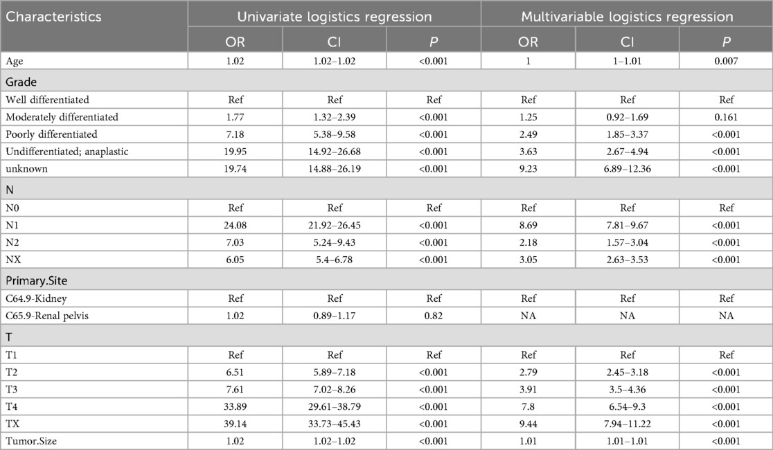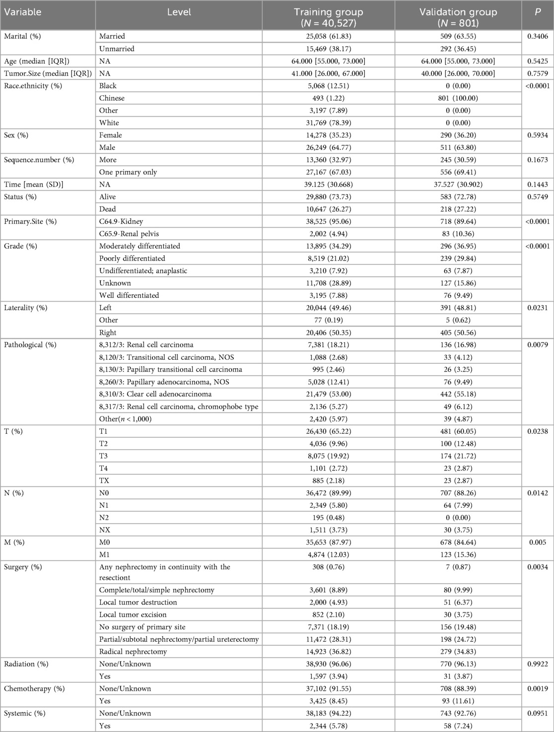A total of 40,527 patients from SEER database diagnosed between 2010 and 2017 were enrolled in this study. Among these patients, there were 38,525 kidney cancer patients and 2002 renal pelvis cancer patients at initial diagnosis. The detailed clinicopathological features of the whole cohort were presented in Table 1. The training group included 40,527 patients and validation group included 801 patients. And the correlation analysis of these features was displayed in Figures 1A,B.