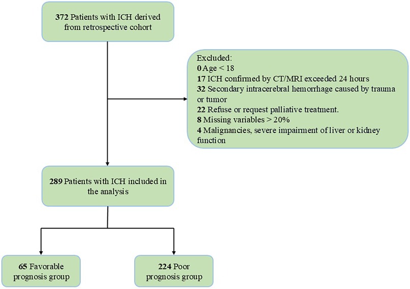 Spontaneous intracerebral hemorrhage (ICH), defined as acute extravasation of blood into the brain parenchyma secondary to cerebrovascular rupture, is recognized as the most lethal form of acute stroke (1), carrying an early mortality rate of 30%–40% (2). In the United States, ICH accounts for approximately 10% of the estimated 795,000 annual stroke cases (3). Despite significant advancements in minimally invasive surgical techniques in recent years, postoperative functional recovery in patients demonstrates marked heterogeneity. Notably, no clinical outcome improvement was observed in preoperatively comatose patients undergoing surgical intervention (4). This prognostic uncertainty poses substantial challenges for clinical decision-making, rehabilitation resource allocation, and physician-patient communication. Current prognostic scoring systems (e.g., ICH Score, FUNC Score) incorporating parameters such as age, hematoma volume, and Glasgow Coma Scale (GCS) (5, 6), demonstrate significant limitations when applied to postoperative functional recovery prediction. Most existing models were developed using Western population datasets and have demonstrated suboptimal performance during external validation in Asian cohorts (7).