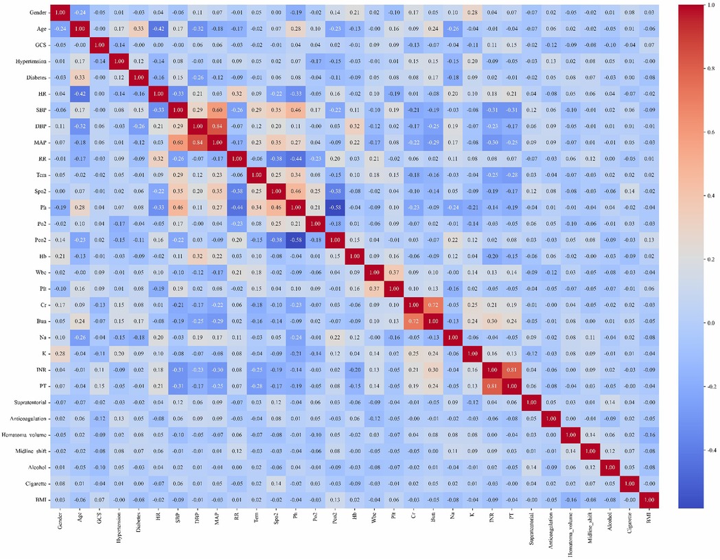 Given the retrospective design of this study, a priori sample size calculation was not performed. Continuous variables were expressed as mean ± standard deviation (SD) when normally distributed (assessed by Shapiro–Wilk test), or median with interquartile range (IQR, 25th–75th percentiles) for skewed distributions. Categorical variables were reported as percentages (counts/total counts). For continuous variables, we perform a t-test or a Mann–Whitney U-test to compare between groups. For categorical variables, we use the chi-square test or Fisher's exact test. Variables with >20% missing data were excluded from multivariable analysis. For variables with ≤20% missingness, multiple imputation was implemented via the MICE package (Multivariate Imputation by Chained Equations) (11). Collinearity among predictors was systematically evaluated visualized in a correlation heatmap (Figure 2). All analyses were performed using R Statistical Software (v4.4.2) and Python (v3.9).