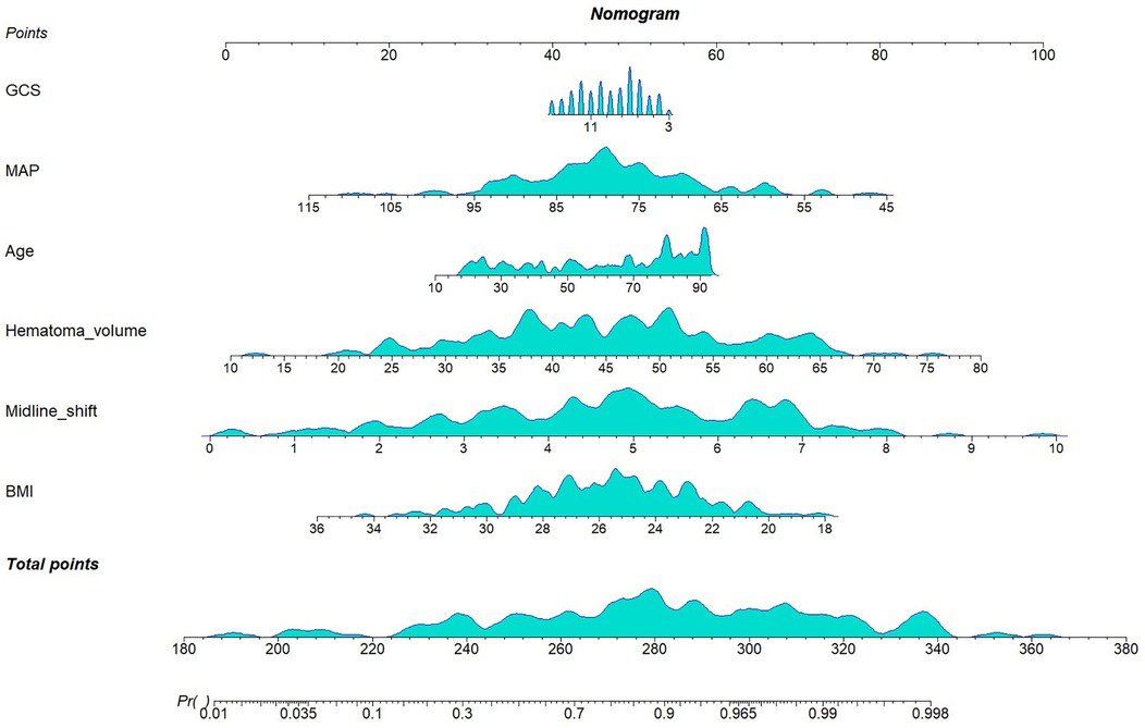 In this study, poor functional outcome was defined as mRS score >2, while favorable outcome was defined as mRS score ≤2. Our final model identified six robust predictors of postoperative functional recovery: midline shift, hematoma volume, age, MAP, BMI, and GCS score. Notably, this prognostic tool integrating both neuroimaging features (midline shift, hematoma volume) and MAP with traditional clinical variables in spontaneous ICH surgical cohorts. This provides clinicians with a valuable tool for prognostic assessment in such patients, enhancing the precision of postoperative outcome prediction.