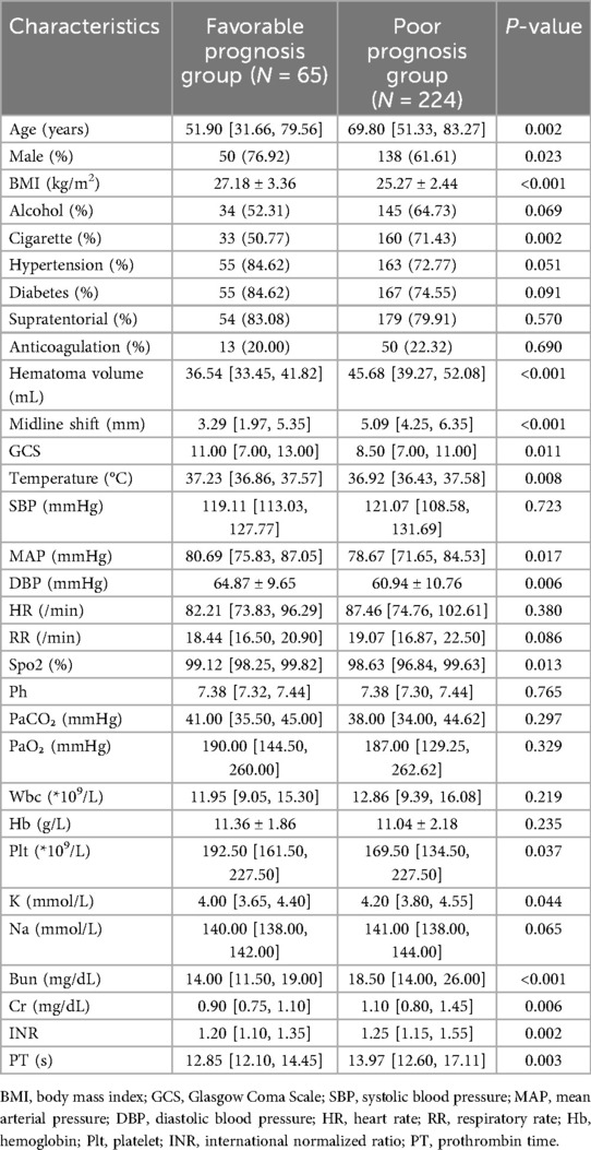 This study ultimately included 289 patients with spontaneous intracerebral hemorrhage (ICH), among whom 65 patients achieved favorable outcomes (mRS ≤ 2), and 224 patients had poor outcomes (mRS > 2). Baseline characteristics such as alcohol consumption history (p = 0.069), hypertension (p = 0.051), diabetes (p = 0.091), supratentorial hemorrhage location (p = 0.57), and anticoagulant use (p = 0.69) showed no significant differences between the groups. Physiological parameters, including SBP (p = 0.723), heart rate (p = 0.38), respiratory rate (p = 0.086), pH (p = 0.765), PaCO₂ (p = 0.297), PaO₂ (p = 0.329), and laboratory markers such as white blood cell count (p = 0.219), hemoglobin (p = 0.235), and serum sodium (p = 0.065), also demonstrated no significant intergroup differences. However, the poor prognosis group exhibited statistically significant differences (p < 0.05) in multiple critical predictors compared to the favorable prognosis group. The poor prognosis group was older, had a higher proportion of females, and showed elevated smoking history prevalence; larger hematoma volume and greater midline shift; lower BMI and GCS scores, higher body temperature, and reduced mean arterial pressure, diastolic blood pressure, and oxygen saturation; lower platelet counts, elevated potassium, blood urea nitrogen, creatinine, international normalized ratio, and prothrombin time (Table 1).