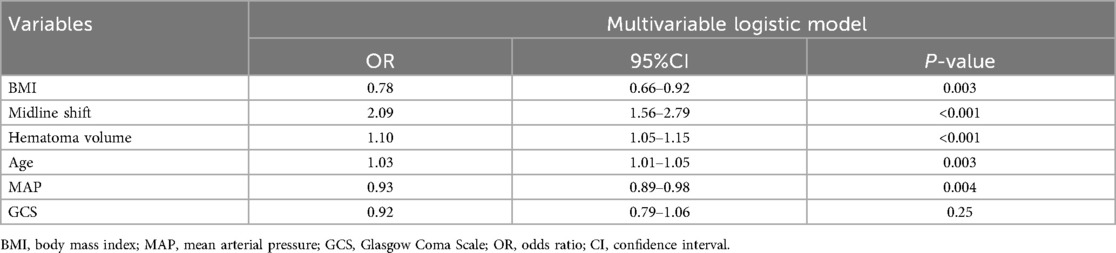 In the training cohort (n = 202), the six selected predictors: midline shift, hematoma volume, age, MAP, BMI, and GCS, were incorporated into a multivariable logistic regression model. The final model demonstrated the following adjusted odds ratios (aORs) with 95% confidence intervals (Table 2): BMI (OR: 0.78; 95%CI 0.66–0.92), midline shift (OR: 2.09; 95%CI 1.56–2.79), hematoma volume (OR: 1.10; 95%CI 1.05–1.15), age (OR: 1.03; 95%CI 1.01–1.05), MAP (OR: 0.93; 95%CI 0.89–0.98), GCS (OR: 0.92; 95%CI 0.79–1.06). A clinical nomogram integrating these predictors was constructed, assigning weighted points proportional to each variable's β-coefficient (Figure 4).