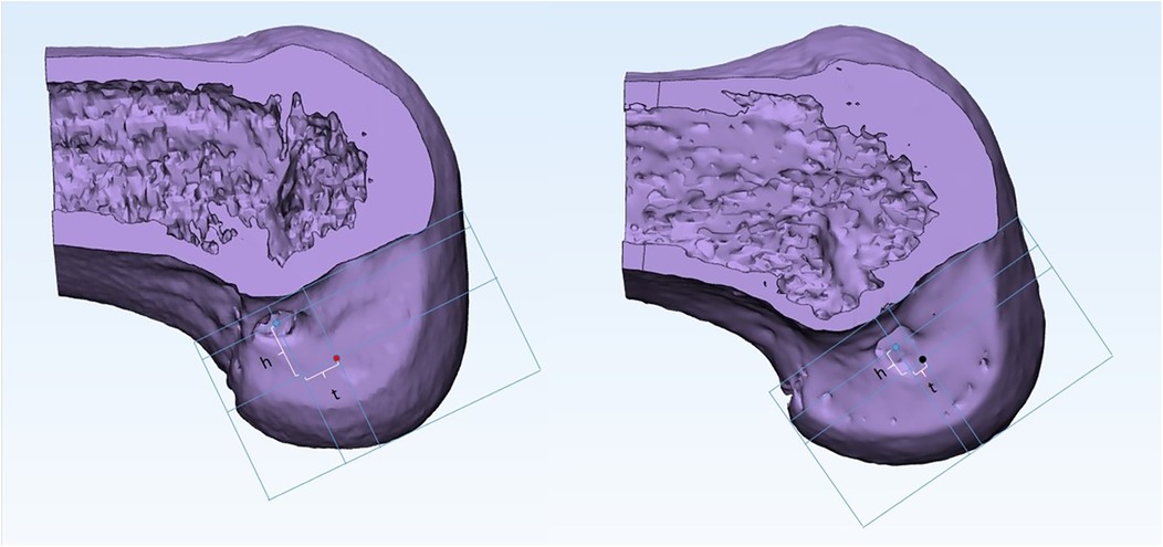 Using Mimics research software (version 19.0; Materialise, Inc., Leuven, Belgium) for 3D reconstruction of CT data (precise observation of bone tunnels in 3D views (22), the femur was divided into two parts along the highest point of the intercondylar ridge, and the lateral part was measured. Based on previous research, we defined the standard site as approximately 40% of the proximal-to-distal distance of the lateral notch, centered between the lateral intercondylar ridge and the posterior articular margin (23). According to the Bernard Quadrant method, the femur was scribed and the height(h) between the midpoint of the actual bone tunnel and the standard site in the anterior and posterior directions, as well as the depth(t) in the upper and lower directions (24) (Figure 1) were measured. These measurements were then converted into percentages using the following formulas: h% = h/H and t% = t/T, where H represents the total height (superior-inferior length) of the lateral notch and T represents the total depth (anterior-posterior length) of the lateral notch. However, because the tibial bone tunnel was located based on the residual ACL, we did not measure or analyse the tibial side. The measurement of the curvature of the ACL graft is shown in Figure 2. In brief, CT data were initially reconstructed in 3D using Mimics software. The graft position was defined by the apertures of the tibial tunnel, distal femoral tunnel, and proximal femoral tunnel. Subsequently, the graft bending angle was measured accurately using the software. All surgeries in this study were performed by two orthopedic surgeons, each with over four years of experience in anterior cruciate ligament reconstruction. Both surgeons were highly proficient in both the AM and HTT techniques and adhered to standardized surgical protocols at the same institution. All measurements were conducted by two experienced clinicians were blinded to the drilling method, with reference to (25) for standard loci, and the average of the measurement values was used for statistical analysis. Two observers each performed measurements three times, and the average value was taken as the final result to minimize inter-observer variability. Inter- and intra-observer reliability was assessed using intraclass correlation coefficients(ICCs). Two blinded clinicians performed measurements twice at 2-week intervals. ICCs(model 2,1) were 0.91(95% CI: 0.85–0.95) for t% distance and 0.89(95% CI: 0.82–0.93) for graft bending angles, indicating excellent agreement.