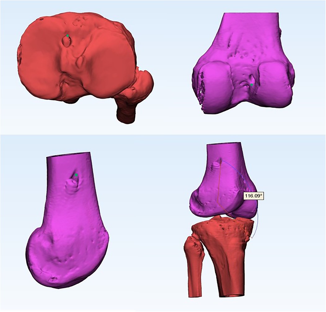 Figure 2. Schematic diagram measuring the curvature of the ACLR graft in a 3D view. The green dot represents the position where the angle is measured. ACLR, anterior cruciate ligament reconstruction; 3D, three-dimensional.