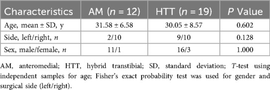 Thirty-one patients who underwent ACLR surgery using the AM and HTT techniques at [Masked for review] 29 October 2019 to 6 February 2023 were included in the present study. The patients were divided into two groups: AM (n = 12) and HTT (n = 19). The average age ± standard deviation (SD) of the AM and HTT groups were 31.58 ± 6.58 and 30.05 ± 8.57, respectively. The number of surgical sides (left/right) was 2/10 and 9/10, respectively, for the AM and HTT groups. The sex distribution (male/female) was 11/1 and 16/3, respectively, for the AM and HTT groups. There were no statistically significant differences in age, surgical side, and sex between the two groups (P = 0.602, 0.128, and 1.000, respectively). The two groups were analysed using independent sample t-tests for age and Fisher's exact probability test for surgical side and sex (Table 1).