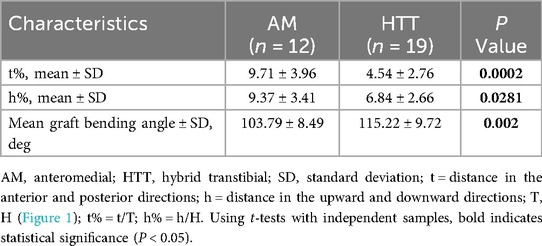 Results: Thirty-one patients were included in the study: 12 and 19 in the AM and HTT groups, respectively. Compared with the AM group (9.71 ± 3.96, 9.37 ± 3.41), the HTT group had significantly smaller percentage distances t% (4.54 ± 2.76) in the anterior and posterior directions, and percentage h% (6.84 ± 2.66) in the upward and downward directions (P = 0.0002, P = 0.0281). The bending angles of the grafts in the AM and HTT groups were 103.79 ± 8.49 and 115.22 ± 9.72, respectively (P = 0.002), and the AM composition angle was more pronounced.