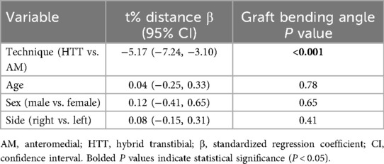 The means ± SD of percentage distance t% in the anterior and posterior directions of the AM and HTT groups were 9.71 ± 3.96 and 4.54 ± 2.76, respectively, and the means ± SD of percentage distance h% in the upper and lower directions were 9.37 ± 3.41 and 6.84 ± 2.66, respectively. The mean gradient angles ± SD were 103.79 ± 8.49 and 115.22 ± 9.72, respectively, in the AM and HTT groups. There were statistically significant differences between the two groups in terms of distance t, distance h, and grade bonding angles (P = 0.0002, 0.0281, and 0.002, respectively) (Table 2). In the multivariate linear regression analysis adjusted for age, sex, and surgical side (right vs. left), surgical technique (HTT vs. AM) emerged as the sole significant predictor for both t% distance and graft bending angle. Specifically, HTT was associated with a 5.17% reduction in t% distance [β = −5.17, 95% CI (−7.24, −3.10), P < 0.001] and an 11.43° increase in graft bending angle [β = 11.43, 95% CI (4.82, 18.04), P = 0.001] compared to AM. None of the covariates—age (β = 0.04, P = 0.78), sex (β = 0.12, P = 0.65), or surgical side (β = 0.08, P = 0.41)—showed statistically significant associations with either outcome. Notably, the absence of a significant effect for surgical laterality (P > 0.05) provides evidence supporting anatomical symmetry in the outcomes of anterior cruciate ligament (ACL) reconstruction. Regression analysis adjusting for demographic and anatomic covariates confirmed technique-dependent differences (Table 3).