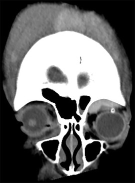 A follow-up CT performed 5 days after surgery confirmed that the orbital hematoma had decreased (Figure 3). On the 5th, 10th, and 19th days after surgery, subgaleal hematoma aspiration was performed three times in the neurosurgery department, and 300 cc, 200 cc, and 175 cc of blood were drained, respectively, and a compression bandage was maintained on the head. On the 10th day after surgery, the drain was removed because blood was no longer drained, the lubricating ointment (Durateras ointment, Alcon, USA) was maintained, the antibiotic ointment (Ocuflox ointment, Samil, Korea) was changed to a combination ointment (Maxitrol, Alcon, USA) containing steroids, and oral steroids were discontinued. Twenty days after surgery, proptosis and periorbital swelling of left eye had significantly improved, and fix and follow in both eyes were confirmed, the patient was discharged while maintaining ointment. Six months after discharge, the cornea remained transparent and visual function was confirmed by intact flash VEP.