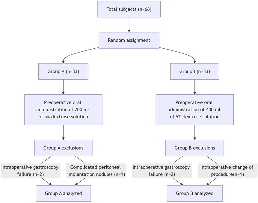 Methods: The present study was conducted as an investigator-initiated, randomised controlled, parallel group, equivalence trial. The study population comprised 66 patients diagnosed with gastric adenocarcinoma, who were randomly assigned to either group A or group B. Patients in group A consumed 200 ml of 5% dextrose solution 2 h prior to the operation, and patients in group B consumed 400 ml of 5% dextrose solution 2 h prior to the operation. gastric contents were suctioned through a gastroscope immediately after endotracheal intubation. The main observation indexes were preoperative gastric residual volume.