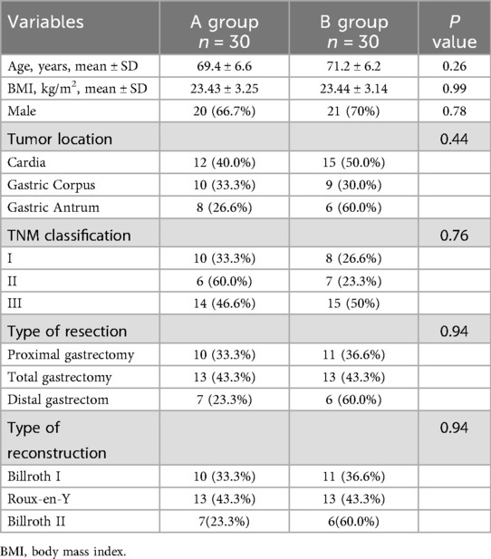 Baseline characteristics were well balanced between groups A and B. There were no statistically significant differences between groups A and B in terms of age, gender, BMI, tumor location, tumor stage, type of surgery, resection and reconstruction (Table 1).