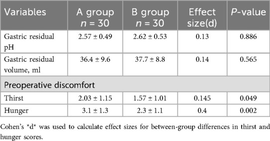 Comparison between the groups showed that the differences in the functional indicators of gastric emptying between the two groups were not statistically significant: gastric juice pH (Group A: 2.57 ± 0.49 vs. Group B: 2.62 ± 0.53, R = 0.14, P = 0.67) and gastric residual volume (Group A: 36.4 ± 9.6 ml vs. Group B: 37.7 ± 8.8 ml, R = 0.14, P = 0.565) did not present a significant differences. The 95% confidence interval for the difference in gastric residual volume (GRV) between the two groups was −2.85 ml to 6.31 ml, which is entirely within the predefined equivalence interval (−10 ml to +20 ml), meeting the criteria for statistical equivalence. In terms of preoperative subjective feelings, the thirst score (2.03 ± 1.15 vs. 1.57 ± 1.01, R = 0.145, P = 0.049) and hunger score (3.1 ± 1.3 vs. 2.3 ± 1.1, R = 0.4, P = 0.002) of patients in group B were significantly lower than those in group A. In group B, the thirst score was significantly lower than that of patients in group A. See Table 2 for details.