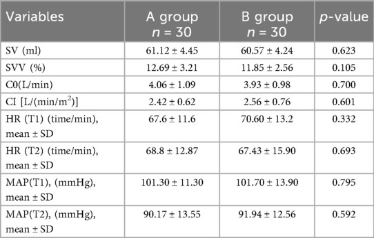 As shown in Table 3, all hemodynamic parameters and heart rate indexes did not present statistical differences between groups A and B. Specifically, the intergroup differences in SVV (12.69 ± 3.21 vs. 11.85 ± 2.56, P = 0.105) T1 heart rate (67.6 ± 11.6 vs. 70.6 ± 13.2, P = 0.332) and T2 heart rate (68.8 ± 12.87 vs. 67.43 ± 15.90, P = 0.693) between the two groups were not significant. In terms of blood pressure indices, intergroup comparisons of mean arterial pressure [MAP (T1):101.3 ± 11.3 vs. 101.7 ± 13.9, P = 0.795], and mean arterial pressure [MAP (T2):90.17 ± 13.55 vs. 91.94 ± 12.56, P = 0.592] also did not reach statistical significance. In addition, basal cardiac output (C0:4.06 ± 1.09 vs. 3.93 ± 0.98, P = 0.700) and cardiac index (CI:2.42 ± 0.62 vs. 2.56 ± 0.76, P = 0.601), the cardiac output-related parameters, also did not show significant differences between the two groups.