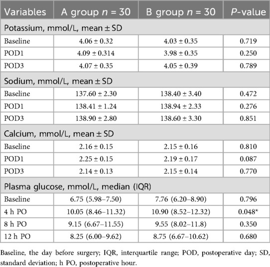 The differences in blood potassium, sodium and calcium levels between the two groups were not statistically significant at all time points. Linear mixed model analysis showed that: (1) for the time effect, the three electrolyte levels showed weak fluctuations postoperatively (F value not reported, P > 0.05), and its potential trend needs to be verified by enlarging the sample or prolonging the observation period; (2) the main effect of grouping was not statistically significant (F value not reported, P > 0.05); and (3) the interaction between time and grouping was not significant (P > 0.05), suggesting that the different rehydration strategies had no significant effect on the electrolyte trends had no significant effect.