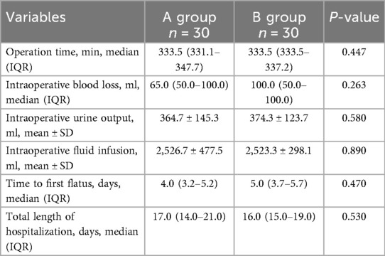 Group A and group B showed a significant difference in operative time (338.3 ± 43.2 vs. 336.7 ± 16.9 min, P = 0.447), intraoperative bleeding (95.7 ± 90.5 vs. 104.7 ± 90.8 ml, P = 0.263), urinary output (364.7 ± 145.3 vs. 374.3 ± 123.7 ml, P = 0.580), total rehydration fluid (2,526.7 ± 477.5 vs. 2,523.3 ± 298.1 ml, P = 0.890), time to initial defecation [4(3.25–5.25) days vs. 5(3.75–5.75) days, P = 0.470] Differences in length of hospitalization [17(14.0–21.0) days vs. 16(15.0–19.0) days, P = 0.530] were not statistically significant (Table 5).
