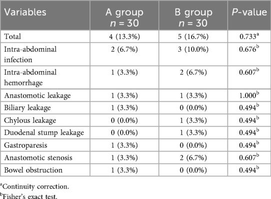 The incidence of postoperative complications in Groups A and B was 13.3% (4/30 cases) and 16.7% (5/30 cases), respectively, and the difference between the groups was not statistically significant (P = 0.733), with some patients combining multiple complications (Table 5). The distribution of specific complications was as follows: group A: 2 cases of abdominal infection (6.7%), 1 case of intra-abdominal hemorrhage (3.3%), 1 case of anastomotic leakage (3.3%), 1 case of biliary leakage (3.3%), 1 case of gastroparesis (3.3%), 1 case of anastomotic stenosis (3.3%), and 1 case of intestinal obstruction (3.3%); group B: 3 cases of abdominal infection (10.0%), 2 cases of intra-abdominal hemorrhage (6.7%), 1 case (3.3%) of ascites, 1 case (3.3%) of anastomotic leakage, 1 case (3.3%) of duodenal stump leakage, and 2 cases (6.7%) of anastomotic stenosis. Analyzed by the continuity-corrected chi-square test and Fisher's exact test, the differences in all complication types between the two groups were not statistically significant (all P > 0.05), suggesting that preoperative oral administration of different amounts of dextrose solution (200 ml vs. 400 ml) did not have a significant effect on the risk of postoperative complications Table 6.