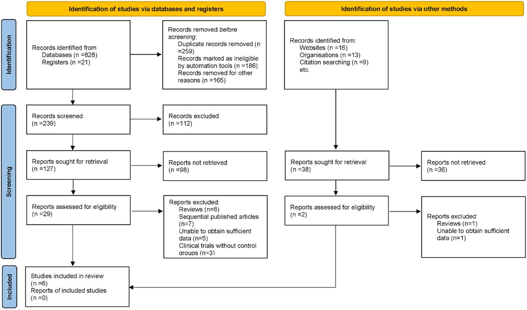 In the initial phase of this systematic review and meta-analysis, a comprehensive search across several electronic databases yielded 887 potential articles. Duplicates were removed, ensuring that each unique study was considered. Titles and abstracts were screened based on predefined inclusion and exclusion criteria, which addressed study methodology, patient demographics, clinical outcomes, and research quality. Following this, 31 articles were identified for full-text review. After a thorough evaluation, 25 studies were excluded due to reasons including review articles (n = 9), sequential publications (n = 7), insufficient data (n = 6), and lack of control groups (n = 3). Ultimately, 6 articles were included in the final analysis (19–24) (Figure 1).