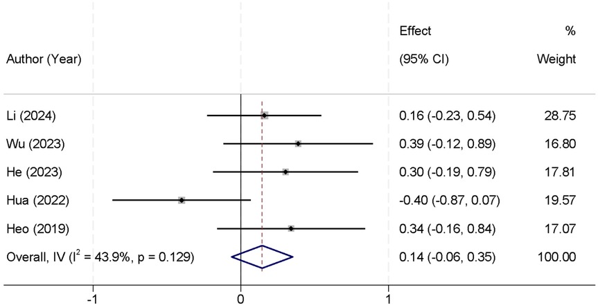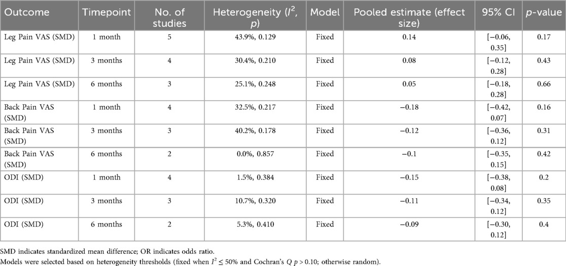 All included values for this outcome were extracted from the 1-month postoperative follow-up timepoint, as this was the only timepoint consistently reported across the included studies. A total of five studies were included in the meta-analysis that reported postoperative leg pain VAS scores. There was no significant heterogeneity observed between the studies (I2 = 43.9%, p = 0.129), allowing the use of a fixed-effect model to pool the results. The combined data indicated that there was no statistically significant difference in postoperative leg pain VAS scores between the two groups [Standardized Mean Difference (SMD) = 0.14, 95% CI (−0.06, 0.35)] (Figure 2). At 3 months, four studies reported leg pain outcomes; heterogeneity remained acceptable (I2 = 30.4%, p = 0.210), and the pooled SMD was 0.08 [95% CI (−0.12, 0.28); p = 0.43], again showing no significant difference. At 6 months (three studies), low heterogeneity (I2 = 25.1%, p = 0.248) supported a fixed-effect model, yielding an SMD of 0.05 [95% CI (−0.18, 0.28); p = 0.66], consistent with earlier timepoints in demonstrating comparable leg pain relief between the two techniques (Table 3).