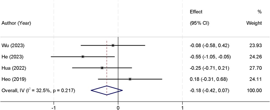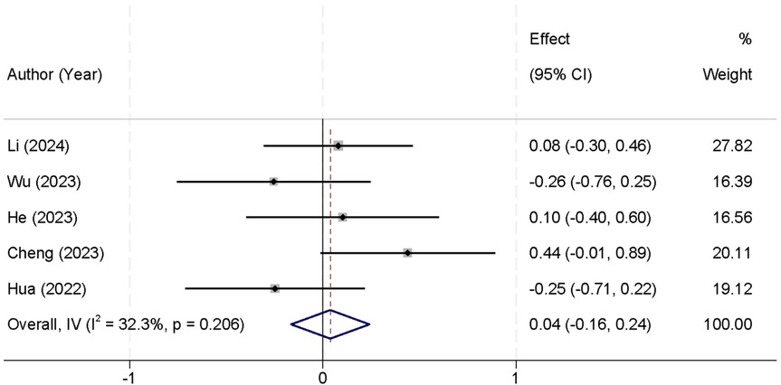 Furthermore, five studies reported data on the length of hospital stay. The analysis revealed no significant heterogeneity (I2 = 32.3%, p = 0.206), and thus a fixed-effect model was used for the analysis. The pooled data showed that there was no significant difference in the length of hospital stay between the two groups [SMD = 0.04, 95% CI (−0.16, 0.24)] (Figure 7).