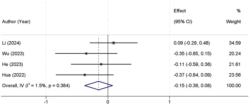 Postoperative ODI scores were uniformly extracted from the 1-month postoperative follow-up across all included studies. Four studies were included in the meta-analysis that reported postoperative ODI scores. The analysis of heterogeneity showed no significant differences between the studies (I2 = 1.5%, p = 0.384), allowing for the use of a fixed-effect model to pool the results. The combined analysis demonstrated that there was no statistically significant difference in postoperative ODI scores between the two groups [SMD = −0.15, 95% CI (−0.38, 0.08)] (Figure 4). At 3 months (three studies), heterogeneity remained low (I2 = 10.7%, p = 0.320), and the SMD was −0.11 [95% CI (−0.34, 0.12); p = 0.35]. At 6 months (two studies), the pooled SMD was −0.09 [95% CI (−0.30, 0.12); p = 0.40] with I2 = 5.3% (p = 0.410), consistent with earlier findings that both techniques yield comparable functional recovery (Table 3).
