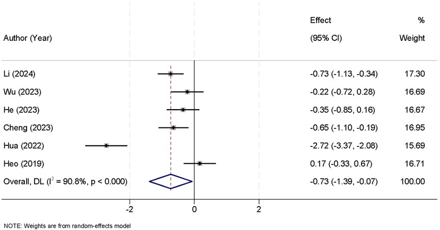 The meta-analysis included six studies that reported data on the duration of surgery. The analysis revealed significant heterogeneity between the studies (I2 = 90.8%, p < 0.001), thus a random-effects model was employed to combine the results. The pooled data showed that the UBE group had a significantly shorter surgical time compared to the UPE group [SMD = −0.73, 95% CI (−1.39, −0.07)] (Figure 5).