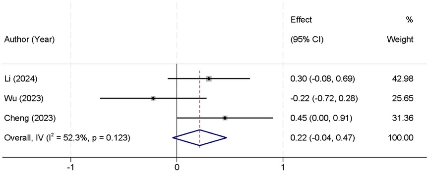 In addition, three studies reported intraoperative blood loss. The analysis showed no significant heterogeneity between the studies (I2 = 52.3%, p = 0.123), allowing the use of a fixed-effect model to pool the results. The combined analysis indicated that there was no statistically significant difference in intraoperative blood loss between the UBE and UPE groups [SMD = 0.22, 95% CI (−0.04, 0.47)] (Figure 6).