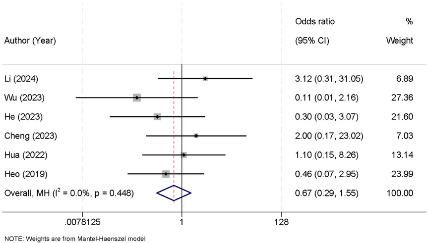 Six studies were included in the meta-analysis that reported data on postoperative complications. The analysis revealed no significant heterogeneity between the studies (I2 = 0.0%, p = 0.448), allowing the use of a fixed-effect model to pool the results. The combined data showed that there was no statistically significant difference in the incidence of postoperative complications between the UBE and UPE groups [OR = 0.67, 95% CI (0.29, 1.55)] (Figure 8).