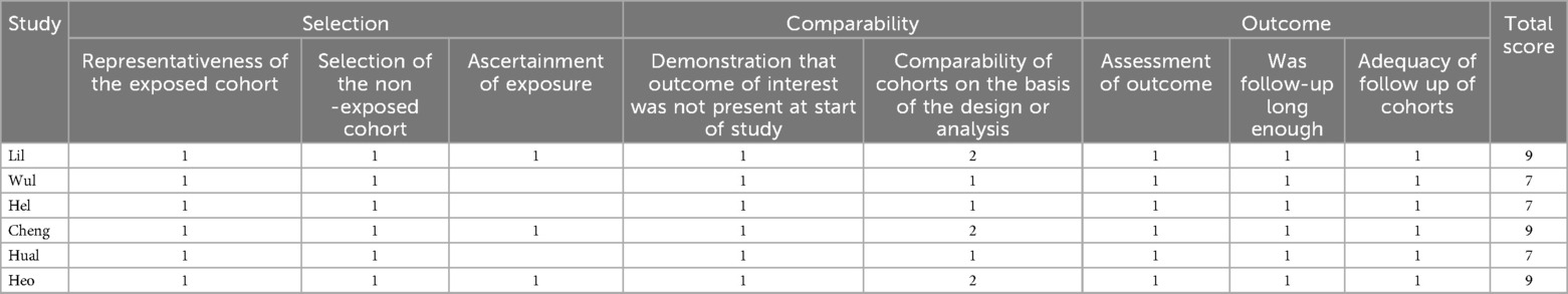 The quality of the studies included in this meta-analysis was assessed independently by two reviewers using the Newcastle-Ottawa Scale (NOS) for quality evaluation (18). The NOS is a widely recognized and validated tool used to assess the methodological quality of non-randomized studies. It evaluates studies across three primary categories: selection, comparability, and outcome. These categories are divided into a total of nine components, with each study awarded a maximum of one star for each component, except for the comparability category, which can receive a maximum of two stars. The total score for each study ranges from 0 to 9, with higher scores indicating better methodological quality. Specifically, studies scoring ≥7 are considered high quality, those scoring between 5 and 6 are categorized as moderate quality, and studies scoring <5 are classified as low quality.