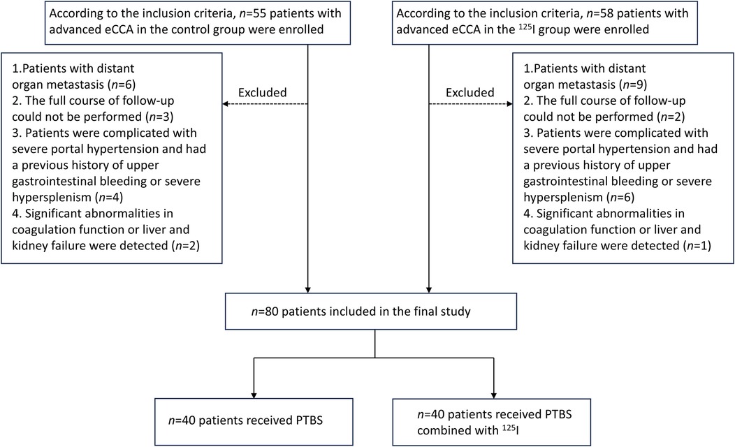 Figure 2. Patient enrollment flowchart. Schematic illustrating participant selection for the comparative study of 125I stent efficacy in eCCA patients undergoing PTBS. eCCA: extrahepatic cholangiocarcinoma; PTBS: percutaneous transhepatic biliary stenting.