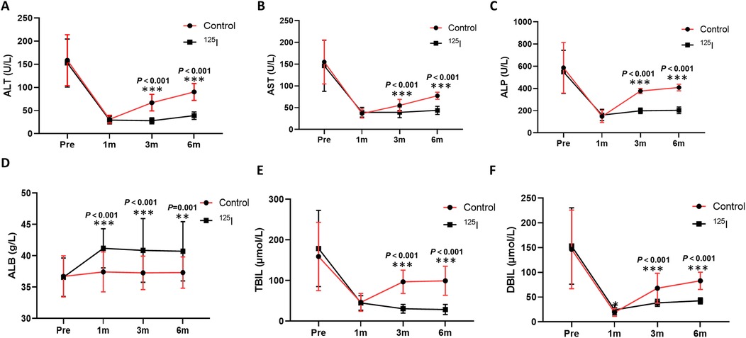Compared with the preoperative level, liver function in both groups was significantly improved after operation. This improvement is evidenced by significant reductions in ALT, AST, and ALP levels at 1, 3, and 6 months following the operation (Figures 3A–C), alongside a significant increase in ALB levels (Figure 3D). There was no significant difference between the 125I group and the control group in the ALT, AST, and ALP levels at 1 month, but there was a significant difference between 3 and 6 months. The ALB levels at 1, 3, and 6 months in the 125I group were greater than those in the control group. The symptoms of jaundice in the two groups were significantly relieved in both groups, which was reflected in the significant decreases in TBIL and DBIL (Figures 3E,F). In addition, the TBIL and DBIL levels in the 125I group were significantly lower than those in the control group at 3 and 6 months. These results suggest that both biliary stenting alone and biliary biliary stenting combined with 125I seed implantation can improve postoperative liver function and reduce obstructive jaundice and that biliary stenting combined with 125I seed implantation are superior to biliary stenting alone.